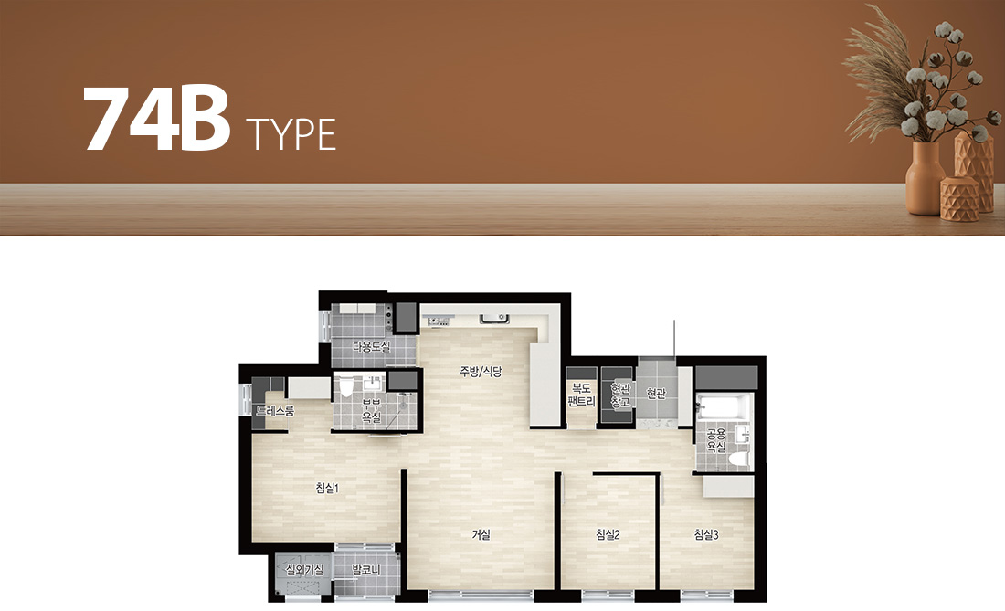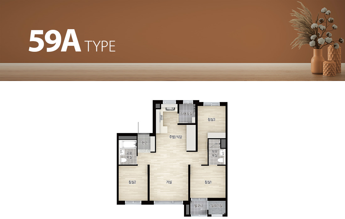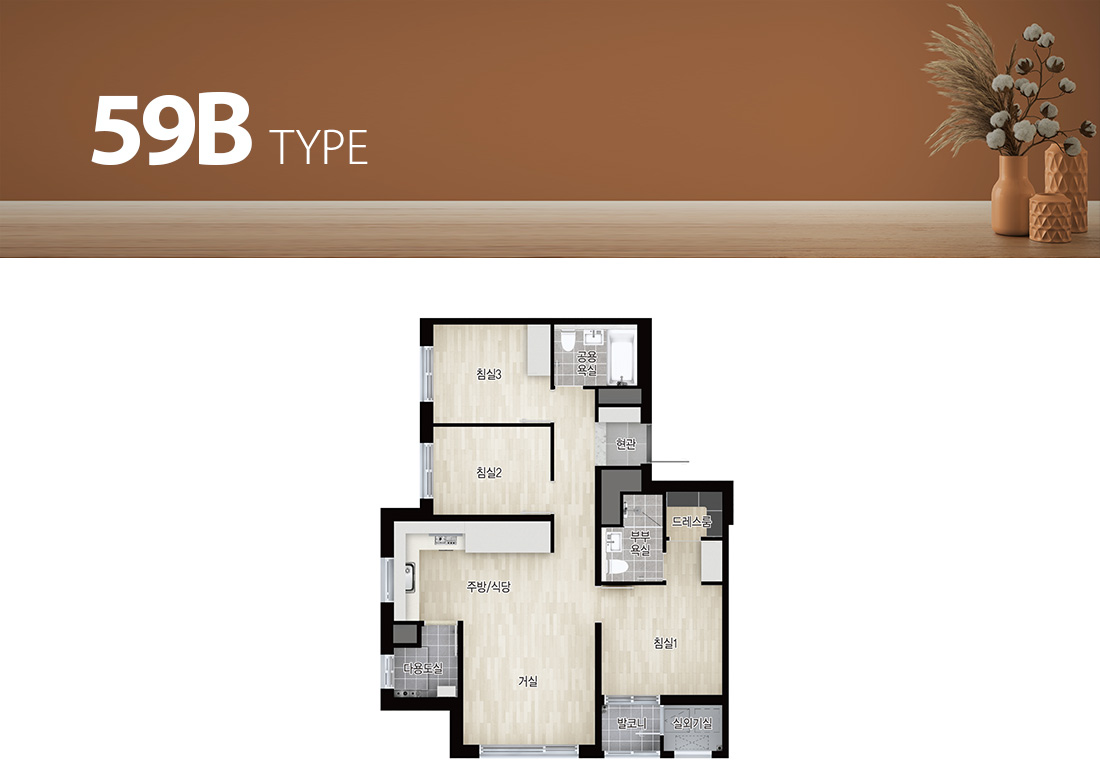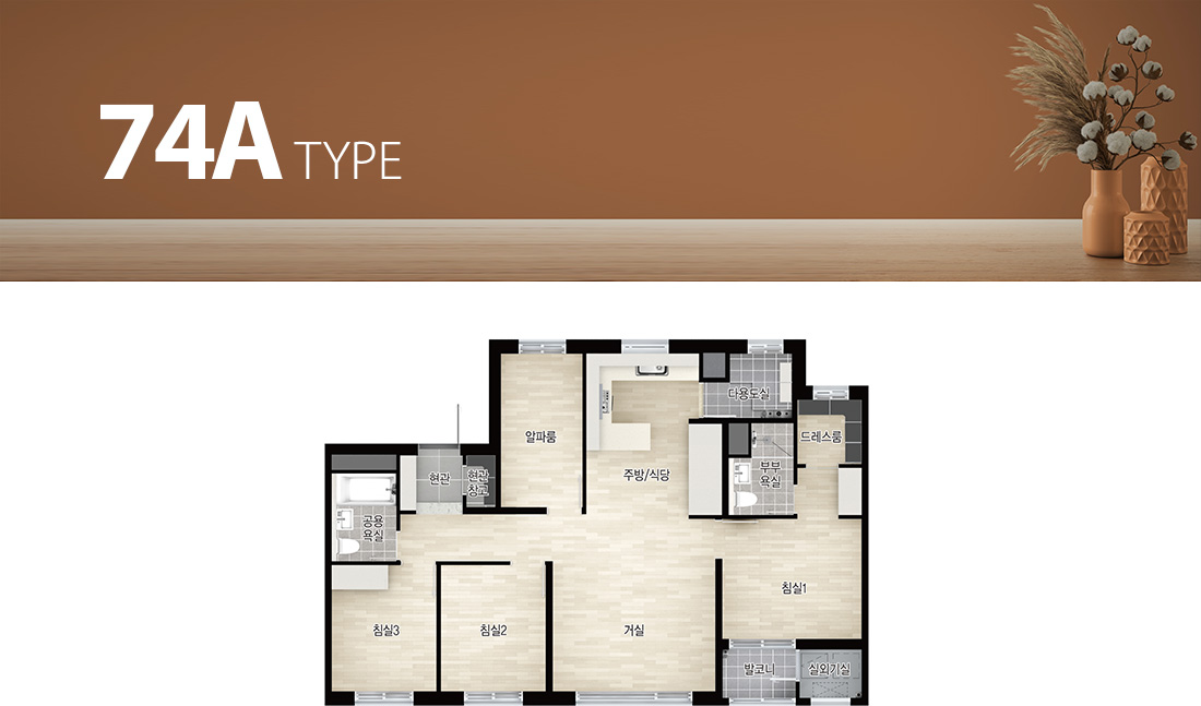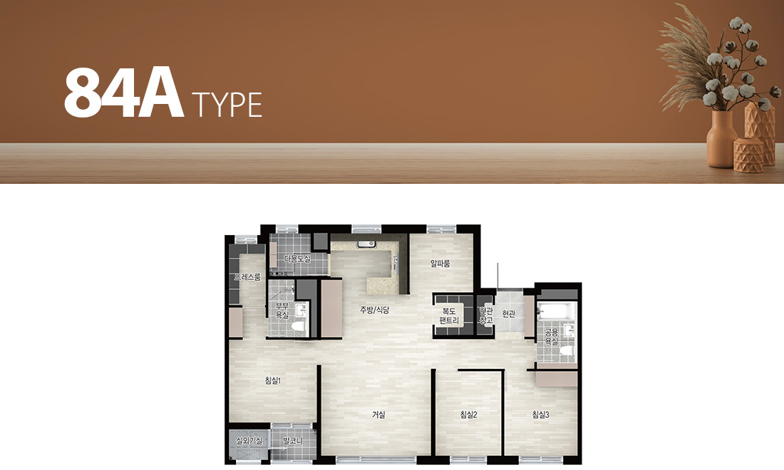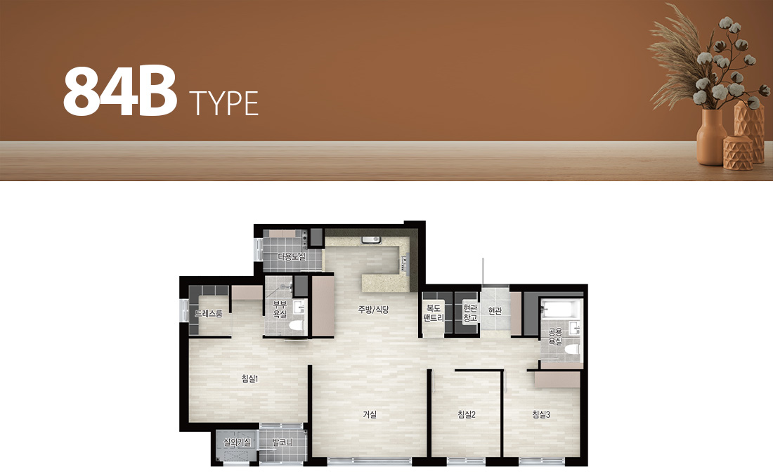 - 발코니 비확장형과 발코니 확장형 시공의 경우 마감재(각 실의 바닥재, 벽면 마감재 등)가 다르니 자세한 사항은 견본주택 및 입주자 모집공고에서 확인하시기 바랍니다.